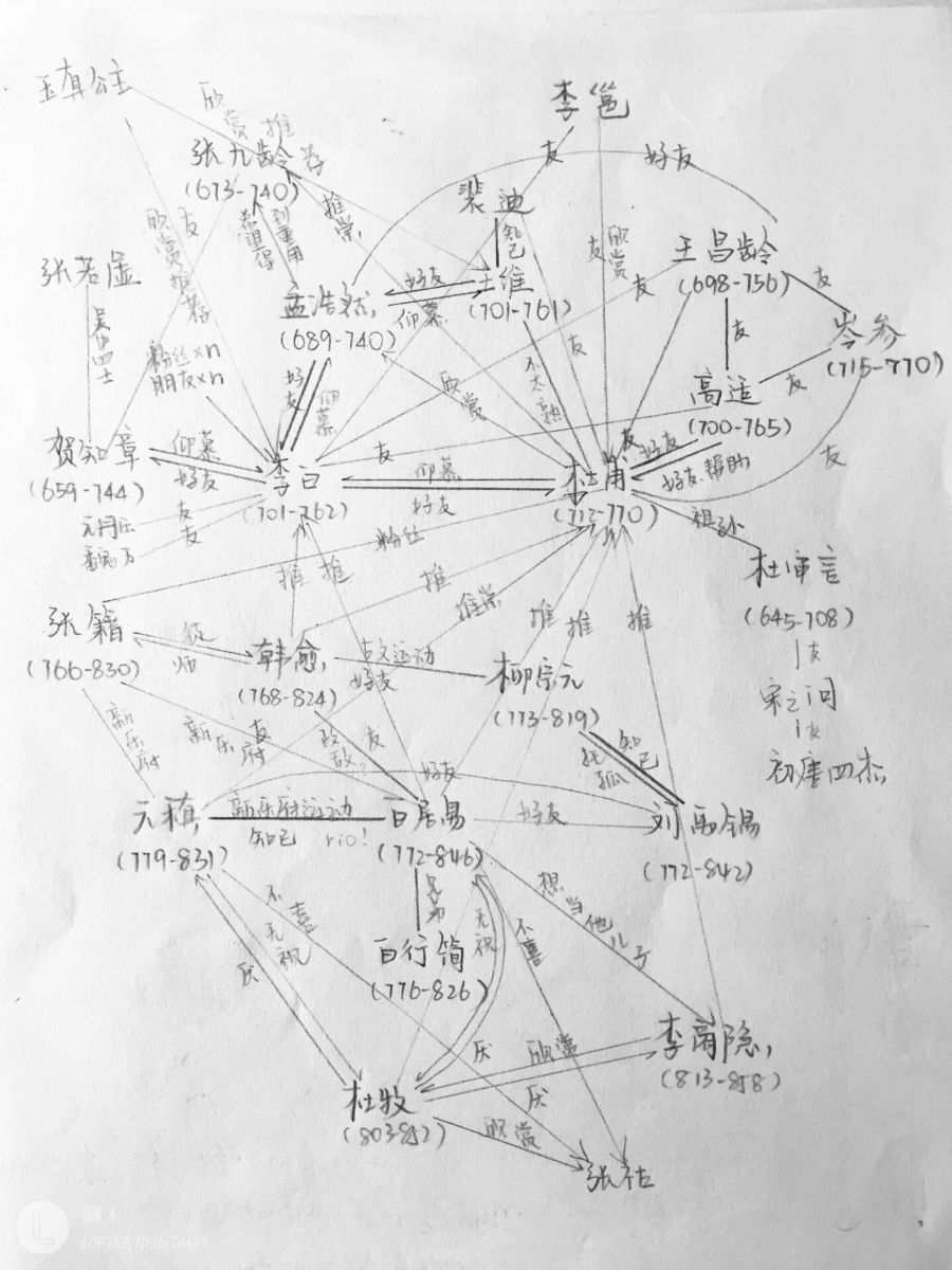 再者,李白牵扯的可不只是一个圈子那么简单,他和高适之前也有过一段,李白和王昌龄又是朋友,高适和王昌龄也是朋友,再加上很多很多的诗人,整个名人圈都要进去了,而李白光是单箭头就不知道有多少!