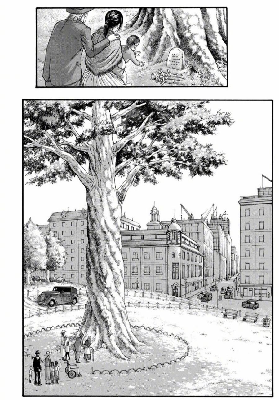 男孩进入树中,巨人之力将得到延续.从倒下的大楼开始生长植物来看,成为废墟的帕岛又经历了很长时间,一个背着枪和行李的少年带着一条狗来到了埋着艾伦的树前。这个镜头显然对应着最初尤弥尔获得巨人之力的时候,可以对比前几幅图,艾伦的墓碑已经逐渐被树吞没了进去,留下了一个树洞引诱着人进去。可以想象这个少年进去之后同样得到了巨人的力量,然后为了拯救帕岛让巨人再次现身,由他当主角的巨人故事将会延续下去。