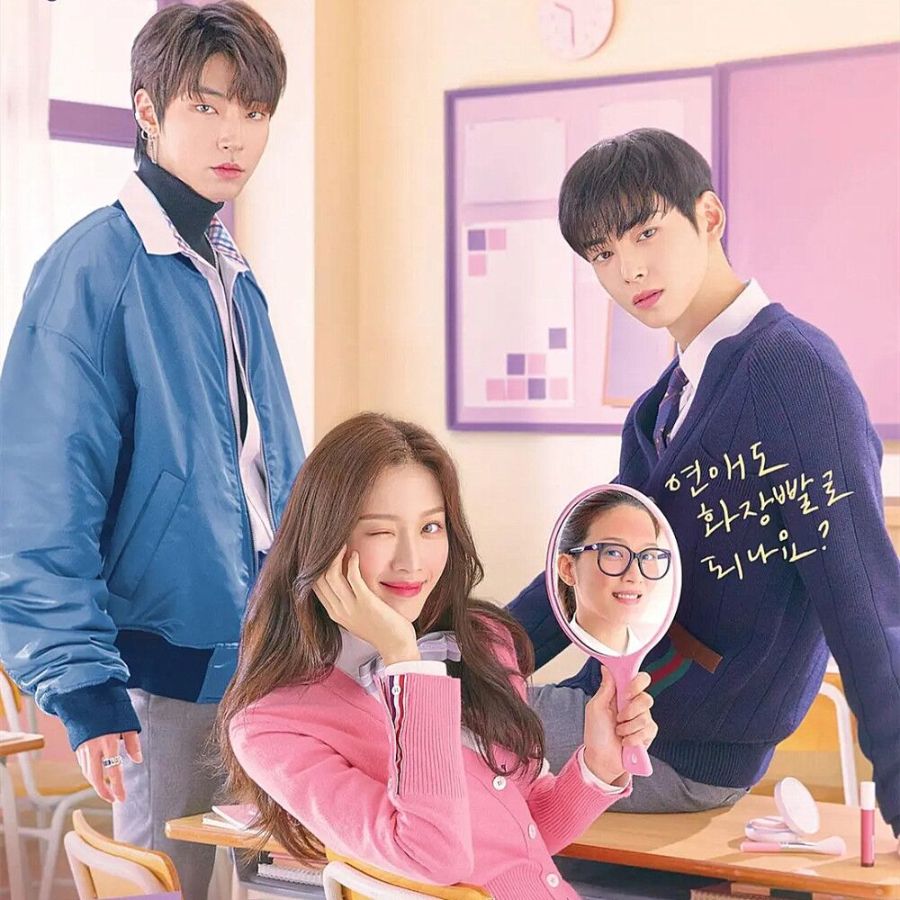 就好比如说真的会有丑小鸭变成白天鹅的故事吗?对这部韩剧开头是女主是一位非常丑陋的面孔因为她的颜值她的容貌她受到了很多的歧视排挤甚至被她原来学校的人欺负喊她去跑腿她的身边人都在嘲笑她这让她有想不开想去跳楼她控制不住她的情绪啊后来她就自己在网上学化妆自己看视频教学去学但是呢一开始很失败画的比原来还难看去学校更是受到了嘲笑和其他人的白眼后来呢她慢慢地跟着教学终于她成了一个大美女而且是很标准的美女她的家人们都看呆了她转校了刚踏入她的新学校她就备受瞩目尤其是学校同学们眼睛从来没有从她身上放下过就是觉得哇塞千年一见的美女然后去了办公室教导主任真的很风趣幽默因为她长得好看所以把她当成全校第一结果在她的对面还是她的亲弟弟后来呢男主就上场了没有老套剧情里面的一见钟情就是实打实的男主对她没意思后来慢慢地吸引了兴趣她走到全班面前说“嗨大家好 我是新转来的林周京 请大家多多指教”然后全班炸开了锅 后来呢男二就出场了我看这部剧就是奔着男二去的 韩书俊 他实打实的校霸 又和男生对着干 典型的偶像剧中的情节 学霸和校霸同时喜欢上了一个女孩子 确实 那个女孩子好幸福但是也很有压迫感 毕竟学校里这么多人虎视眈眈地盯着这两个风云人物呢