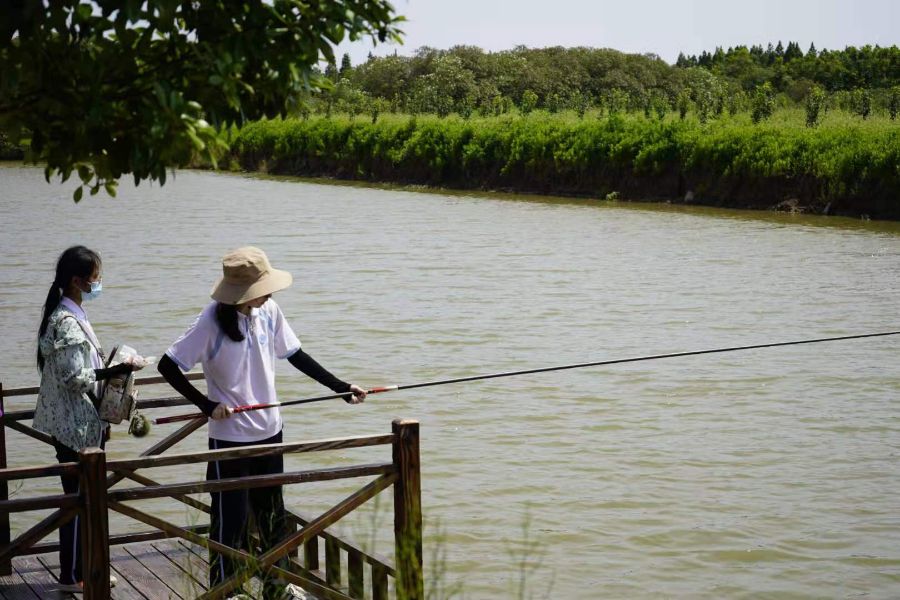 午饭过后,下午一点,五组队伍再出发,来到梨园大棚与垂钓中心,两个项目让学子深入体会到大自然的魅力,在收货大自然的赠予的同时,也进行了劳动采摘与耐性培养。带队老师与学生们细声交谈,积极传授垂钓经验。