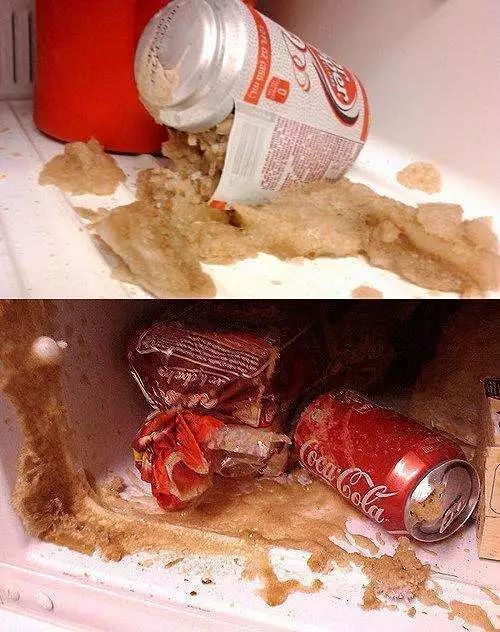 同时,由于这类办公室迷你小冰箱为微型冰箱,整体空间很小,冷冻格子和冷藏格子无法做明显的分层,只是在一个有限空间里用很薄的金属材料制作分隔,爆炸的可乐正好处于冷冻格子下方,受到冷冻格子低温影响,内部结冰发生爆炸。