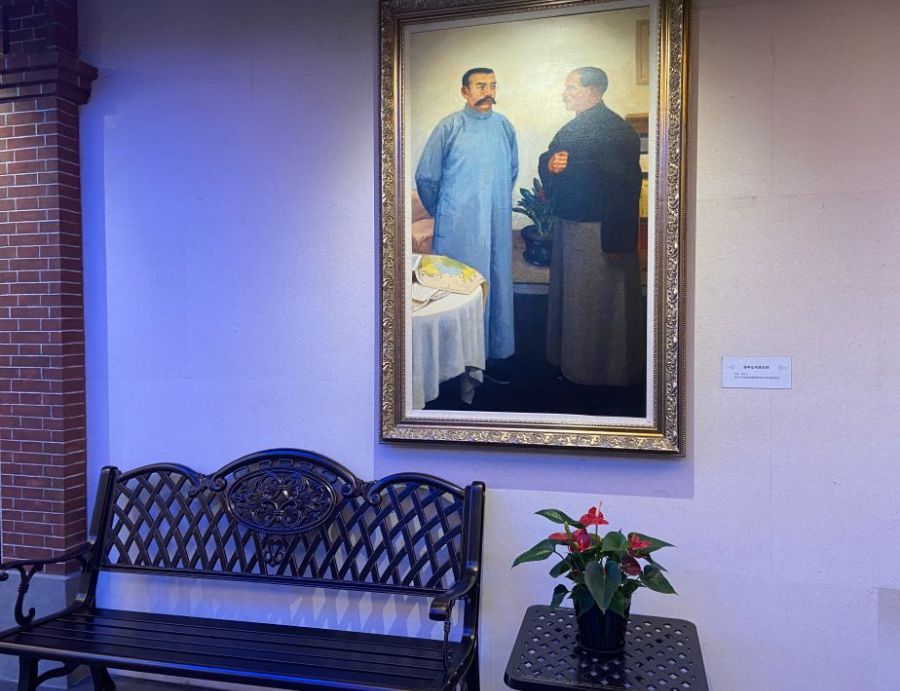 纪念馆入口处,一幅幅弥足珍贵的油画映入眼帘。长廊内,低头可端详革命先辈们的字迹资料,抬头可瞻仰屏幕上五星红旗飘扬的北京天安门,那是我党的象征,更是无上荣光的璀璨未来。