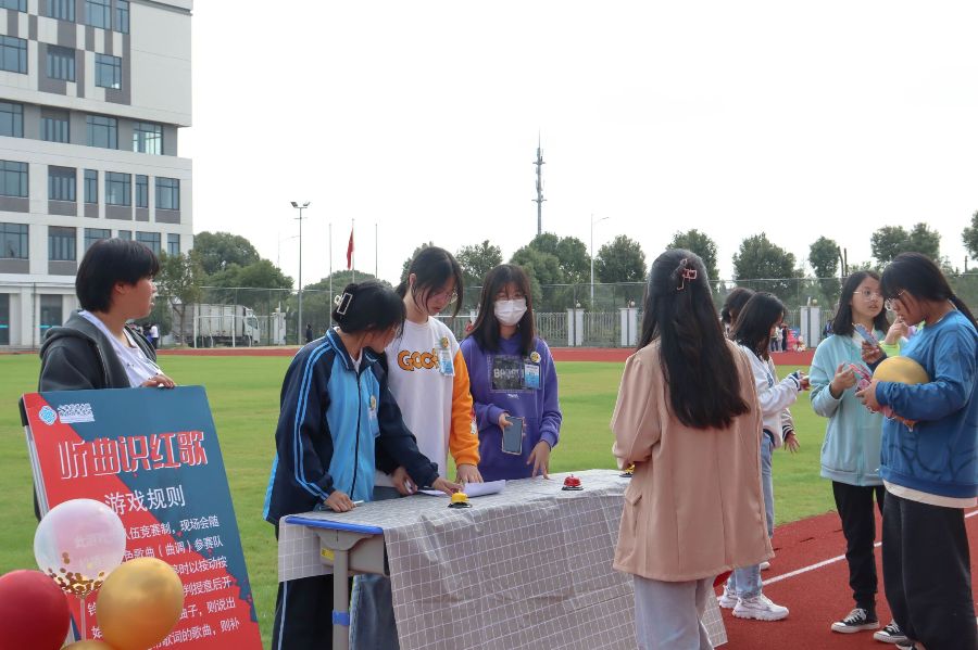 同样受欢迎的还有“听曲识红歌”游戏项目,此游戏需要五人一组同学们听到歌曲暂停后以按动按铃器后抢答。现场同学一个个反应灵敏,由游戏负责人一声令下快速抢答气氛十分活跃。