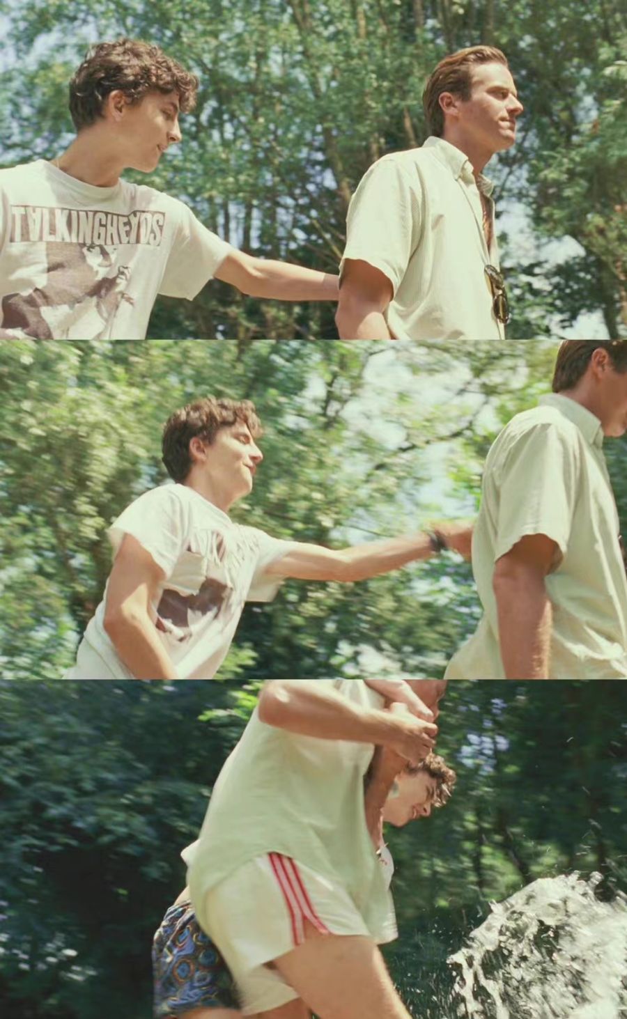 两个相爱的人谈着一场禁忌又没有结果的恋爱,犹如一场幻影。在那个年代,这是避讳的。他们的爱情就是发生在他们身上的一切,彼此的认同还有和那个人在一起时足够的舒适感和安全感。他们愿意把自己的一切展现给对方,对方完全接受并同样把自己展现给他,这个过程就是爱情本身的美好所在。Oliver没有错,他只是陪Elio走到了他能走到最远的地方,24岁的博士生和17岁的少年,他们的感情是顺其自然的,是美好的,一旦发生了,便将留在各自心里,永不磨灭。