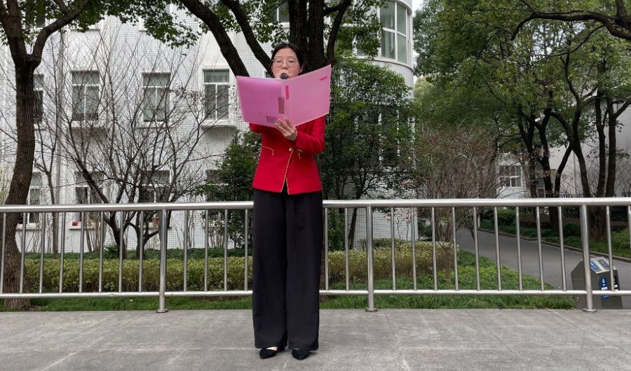 本周的升旗仪式由19级酒店管理中本贯通班谷婷主持, 21级金融中高贯通班的周全倡导大家要在日常生活中向雷锋同志学习,甘于奉献,为大家服务。