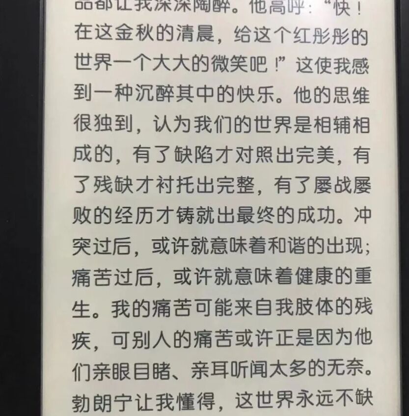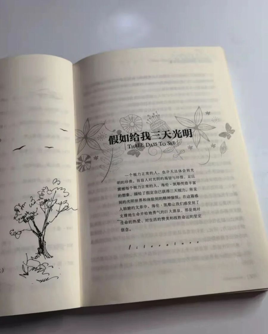 虽然学校里包括校长在内,能与她正常交流的老师也不过两人,且盲文书籍有限,学习的教材基本都无法阅读。但在莎莉文老师的陪伴和友人们的帮助下,通过不懈努力还是实现了自己的愿望考上哈佛大学,学会了英文、法文、德文、拉丁文等多种语言,彻底改变了自己的人生。书的后半部分是她的阅读经历和对生活的感知、看法,充满了阳光和蓬勃生机,读后会感觉胸怀变得宽广,备受启迪,心情舒畅。如她所说: