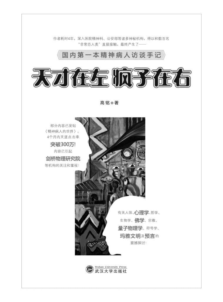是一个朋友推荐给我的这本书,我便试着读了,读后才发现这确实是一本不错的书。这本书以访谈录的形式记载了生活在另一个角落的人群(精神病患者、心理障碍者等边缘人)深刻、视角独特的所思所想,让读者可以了解到疯子抑或天才真正的内心世界,内容涉及生理学、心理学、佛学、宗教、量子物理、符号学以及玛雅文明和预言等众多领域。其内容的真实性我并不知道,但我愿意相信是真的,我觉得他们是早出生的天才。