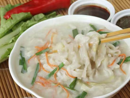 不翻汤属于洛阳的一道非常传统的小吃,曾上过《舌尖上的中国》栏目,这种做法流传至今已经有120多年了,据说还是康熙皇帝微服私访时,在民间尝到的一种美食,后来就册封了不翻汤。不翻汤中的饼非常薄,一面是豆绿一面淡黄,搭配上粉丝,韭菜,海带,香菜等食材,再加上各种调料,配上高汤制作而成,喝着酸辣鲜香。
