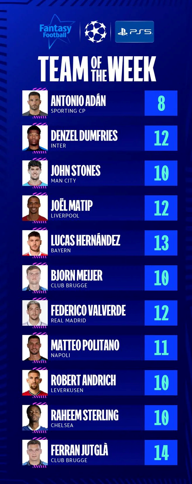 欧冠官方公布了本周欧冠联赛的最佳阵容,切尔西攻击手斯特林、皇马中场巴尔韦德、曼城后卫斯通斯等人入选。