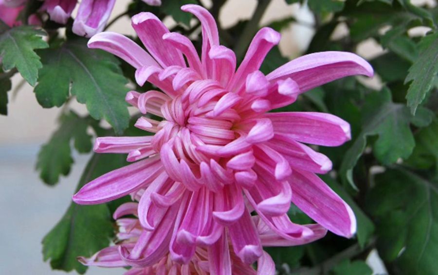 菊花为多年生草本,高 60-150厘米。茎直立,分枝或不分枝,被柔毛。叶互生,有短柄,叶片卵形至披针形,长 5-15公分,羽状浅裂或半裂,基部楔形,下面被白色短柔毛,边缘有粗大锯齿或深裂,基部楔形,有柄。头状花序单生或数个集生于茎枝顶端,直径 2.5-20厘米,大小不一,单个或数个集生於茎枝顶端;因品种不同,差别很大。总苞片多层,外层绿色,条形,边缘膜质,外面被柔毛;舌状花白色、红色、紫色或黄色。花色则有红、黄、白、橙、紫、粉红、暗红等各色,培育的品种极多,头状花序多变化,形色各异,形状因品种而有单瓣、平瓣、匙瓣等多种类型,当中为管状花,常全部特化成各式舌状花;花期 9-11月。