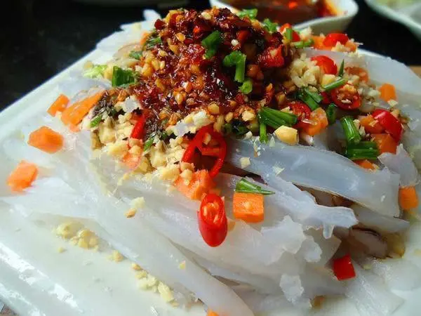 豌豆凉粉是一道美味可口的名点,主要材料有豌豆淀粉、绿豆淀粉等,辅料有盐、葱姜水、蒜泥、醋、酱油、盐、糖、辣椒油、花椒面等,属于川菜系,云南和贵州也经常食用。