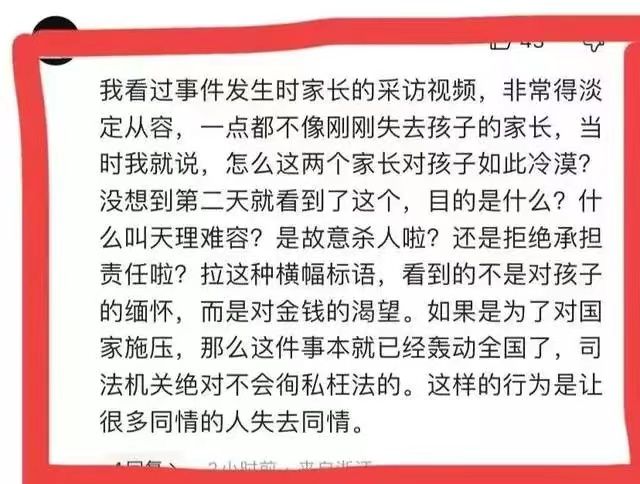 在整个事件中最让我痛心和愤怒的一点是很少有人去关注孩子妈妈说的“司机有二次碾压行为”是不是属实,关注案件的细节如何,关注官方处置这件事是否处置得当,不去关注肇事司机的陈述发言......却一窝蜂拿着放大镜去看孩子妈妈的打扮如何、化的妆如何、言行举止如何。而现在又有许多隐秘的双手伸向了丧子丧妻的父亲身上,他们说或许是丈夫将妻子推下。再悲伤如何,最后还不是会再娶妻......
