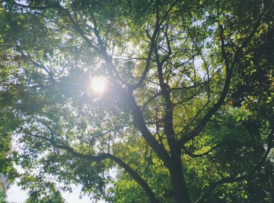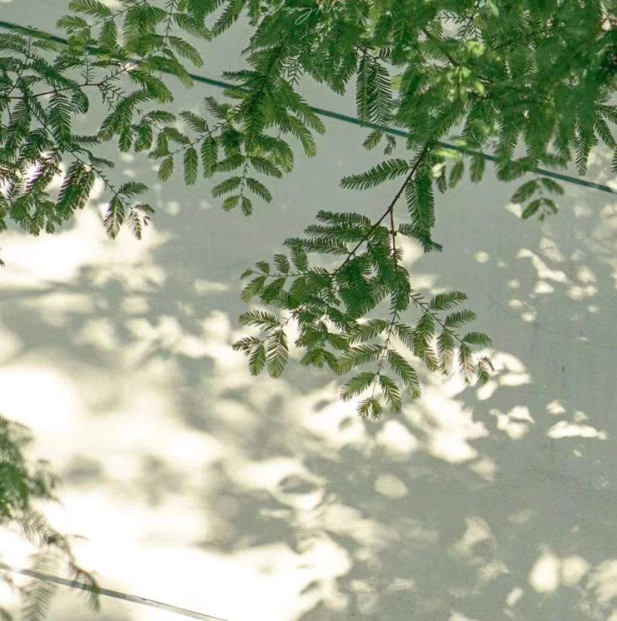 嫩嫩的枝条倾斜下浓绿朦胧着光晕,浅浅的阳光叠进层层的青绿。时而留在叶子的尾尖,勃勃的生机。从缝隙间漏下,筛出细碎的光影,从细细叶脉间迸溅出七彩的晨曦。