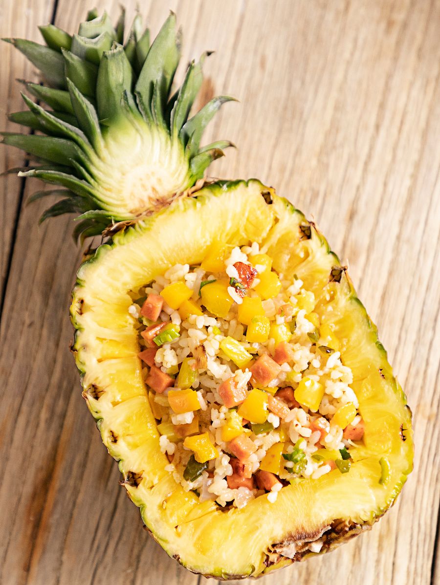 其制作方法是将青豆和玉米粒焯熟后捞出,整个菠萝从三分之一处切开,用刀沿着菠萝外侧划一圈,内侧划十字,用勺子将菠萝肉挖出,浸入淡盐水,虾剥去外壳,去虾线火腿肠切小块,锅内倒入油,加入玉米粒、青豆、火腿肠、虾仁翻炒,倒入米饭翻炒,加入适量盐、蚝油继续炒匀,最后倒入菠萝翻炒即可。