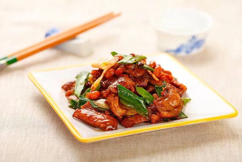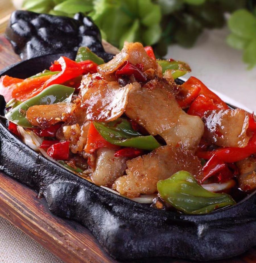 其制作原料主要有猪后臀肉(二刀肉)、青椒、蒜苗等,口味独特,色泽红亮,肥而不腻。回锅肉起源四川农村地区[2]。古代时期称作油爆锅,四川地区大部分家庭都会制作。所谓回锅,就是再次烹调的意思。回锅肉在川菜中的地位是非常重要的,回锅肉一直被认为是川菜之首,川菜之化身,提到川菜必然想到回锅肉。回锅肉色香味俱全,是下饭菜中大部分人会选的菜。川菜中的回锅肉,最佳是蒜苗、仔姜、青椒做“翘头”,而自贡家常菜中的回锅肉,就有青椒、仔姜、葱白配,藠头配,干豇豆配,莲花白配,甚至锅盔配。