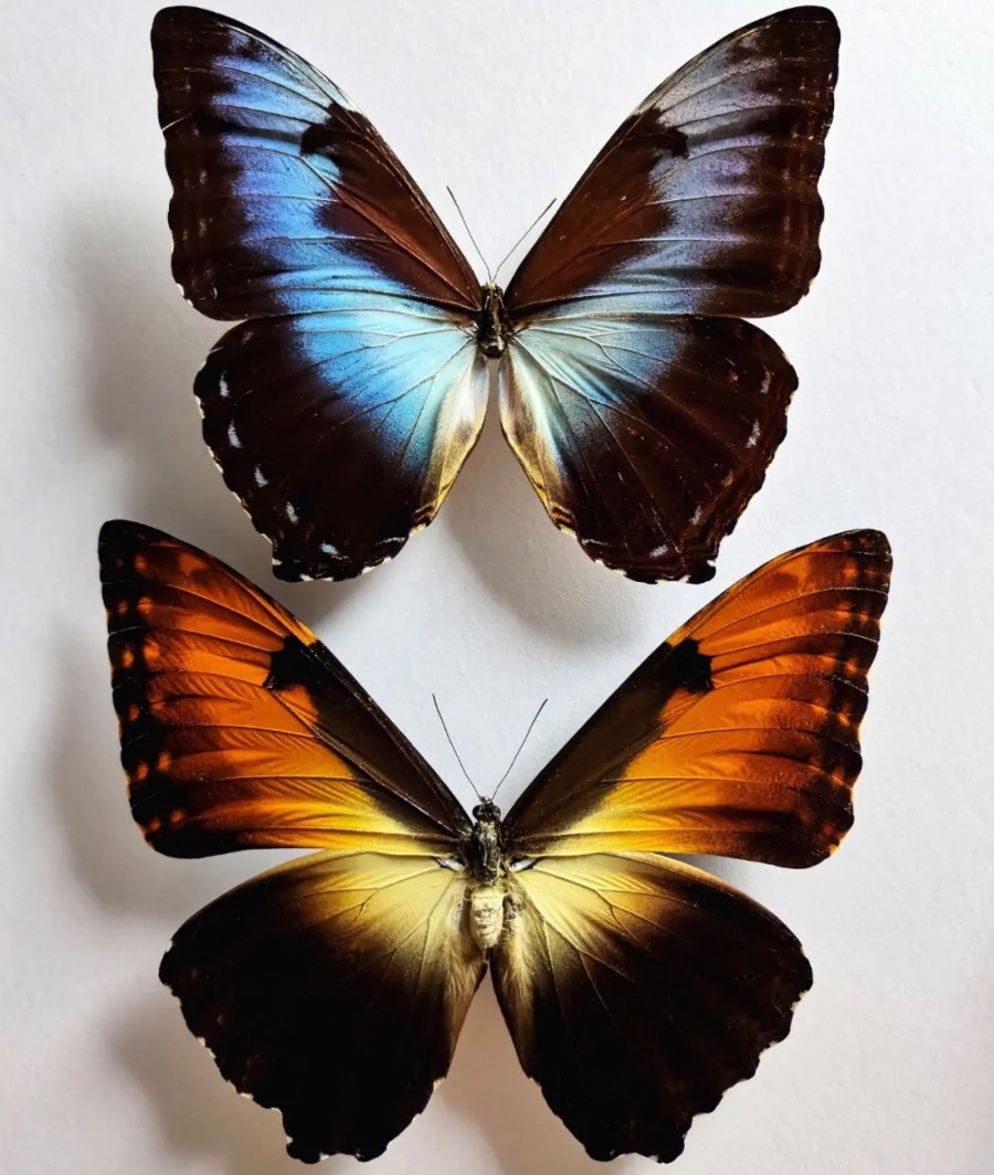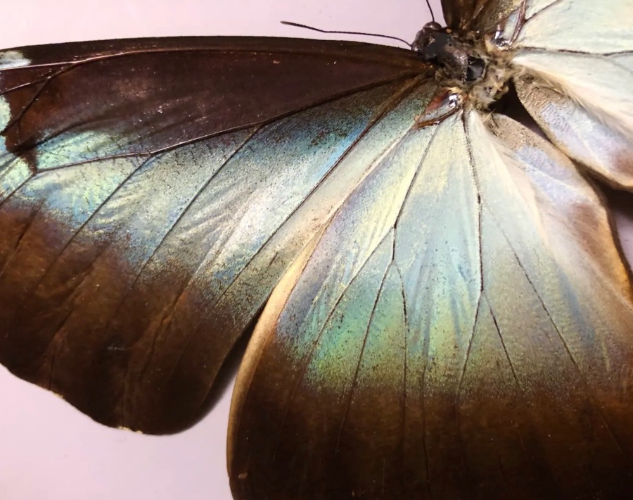 色彩鲜艳,花纹相当复杂。前足相当退化,短小无爪。前翅R脉5条,常共柄。卵呈多种形状,如半圆球形、馒头形、香瓜形或钵形。幼虫头上常有突起,体节上有枝刺,腹足趾钩1至3序中列式。蛹为垂蛹。雄闪蝶的翅上有绚丽的金属般光泽,这与其翅膀上有各种形状的鳞片有关,闪蝶的鳞片结构复杂,细微结构是由多层立体的栅栏构成,类似于百叶窗,只是其结构远比百叶窗复杂。当光线照射到翅上时,会产生折射、反射和绕射等物理现象。于是闪蝶翅上的复杂结构在光学作用下产生了彩虹般的绚丽色彩。当一群闪蝶在雨林中飞舞时,便闪耀出蓝色、绿色、紫色的金属光泽。翅的底面具有成列的眼状斑纹。