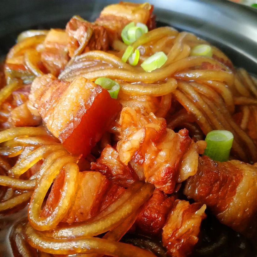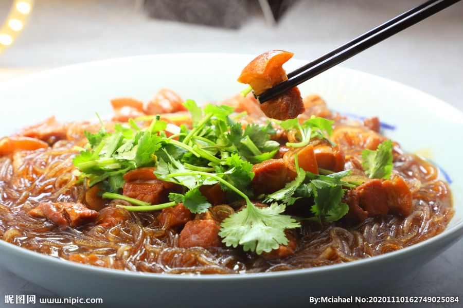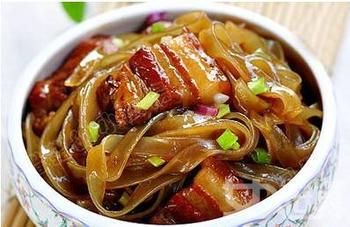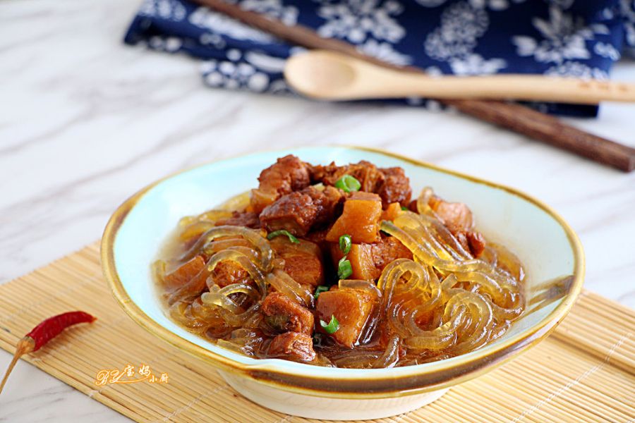 :步骤3:捞起肉块放入冰糖,小火炒成焦糖色。步骤4:放入肉块炒至均匀上色,加入京葱段,八角,姜片,花雕酒炒出香味。步骤5:加入清水1200ml及所有调味料,加盖大火煮开后转小火炖约60分钟。:步骤6:煮至中途,把葱段和姜片捞起:。步骤7:粉条提前用温水浸泡至软。:步骤8:当锅内的水炖至1/3时,放入泡软粉条。:步骤9:中小火开盖煮制,粉条煮的时间要略长些。:步骤10:最后煮至粉条软化,加少许盐调味即可。