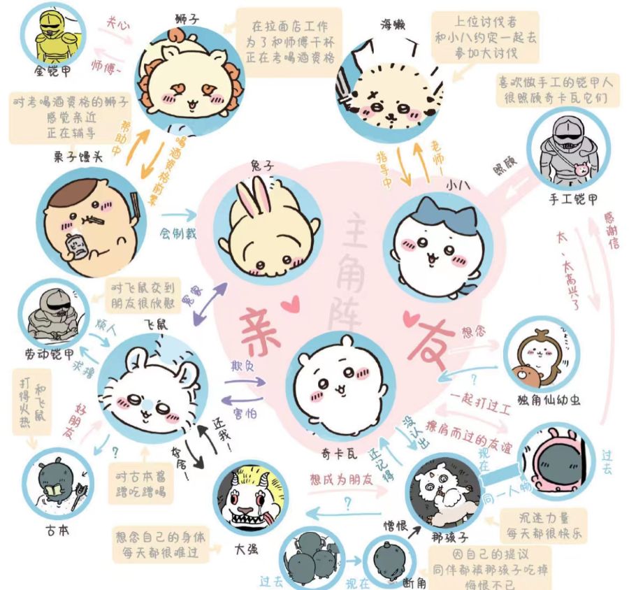 在chikawa的设定中存在一片小森林,森林中存在兔子、猫、仓鼠各种小动物组成的小可爱一族,以及给小可爱们发放人物交付给他们货币和补给品的盔甲一族,除此之外还有戏份极少,但是却威胁着小可爱生命的奇美拉,几大种族就生活在这个类似于世外桃源的乌托邦中很小很可爱的东西通称「小可爱」们带来的轻松愉快、偶尔有些悲伤的故事。虽然有时会因为生活的辛苦而哭泣,但是「小可爱」的周围总是围绕着温柔的朋友和个性丰富的角色们!⋯⋯之类的。