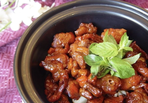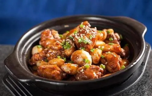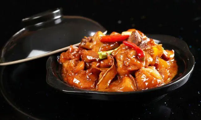 三杯鸡以鸡肉为主料,搭配糯米酒、青椒、红椒等辅料,通过炸鸡肉、炒糖色后进行煮焖,最后浇汁制作而成。
