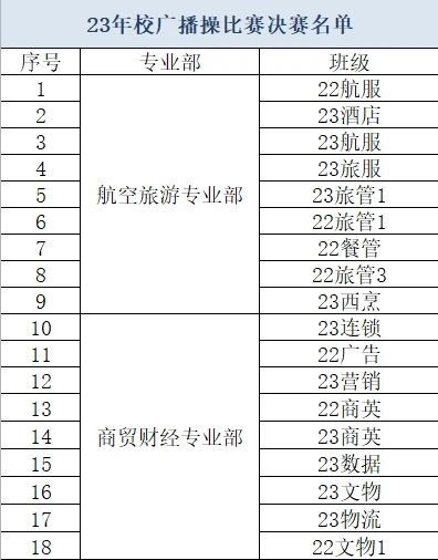 为丰富校园文化生活,提高学生们的身体素质,培养同学们团结协作奋发向上的精神风貌,增强集体荣誉感。10月18日我校商贸财经专业部和航空旅游专业部分别在贵州路101号和浦东南路1548号操场上组织了全校广播操比赛初赛。