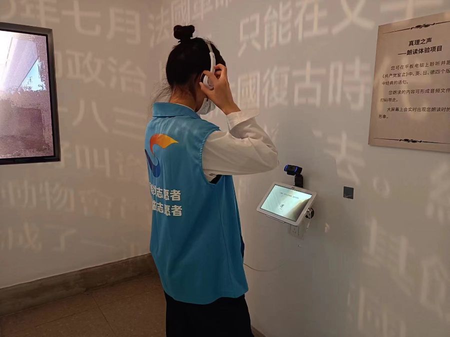 又新印刷所是印刷《共产党宣言》首个中文全译本的旧址,现位于黄浦区复兴中路221弄12号,展出了100本不同语种、不同年代版本的《共产党宣言》真品。22文物1班志愿者团队总共有30人,同学们从接待、背词到现在的讲解,通过志愿服务,他们也可以提高自己的能力和素质。