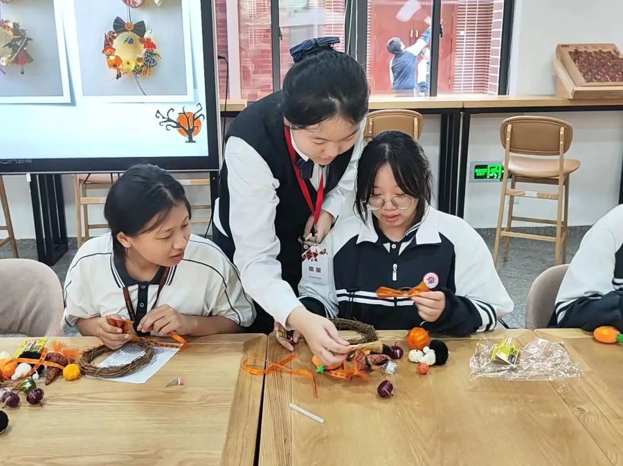 随后李静轩同学又向大家详细的讲解了本次万圣节花环的制作步骤,最后由庄稼、奚嘉雯、陈怡蕾、范雨辰、郑东岳同学带领协助同学们制作精美的万圣节花环。