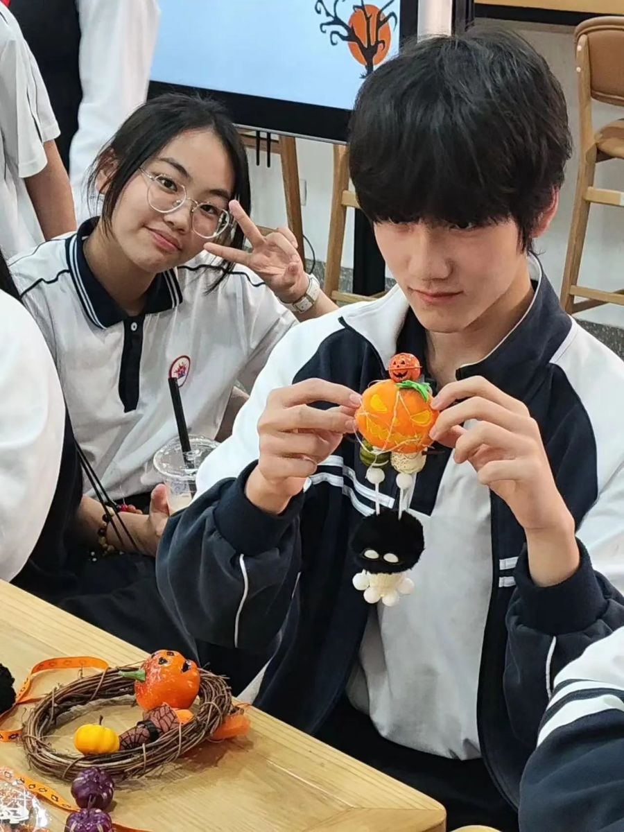 在制作的过程中大家都十分投入,每一位同学都反反复复用材料在花环上不断比划,构思。感受着自己动手创作所带来的快乐,为本次特色值星带来了许多乐趣。最后我们还给大家分发了万圣节糖果,让大家都感受到我们浓烈的万圣氛围。