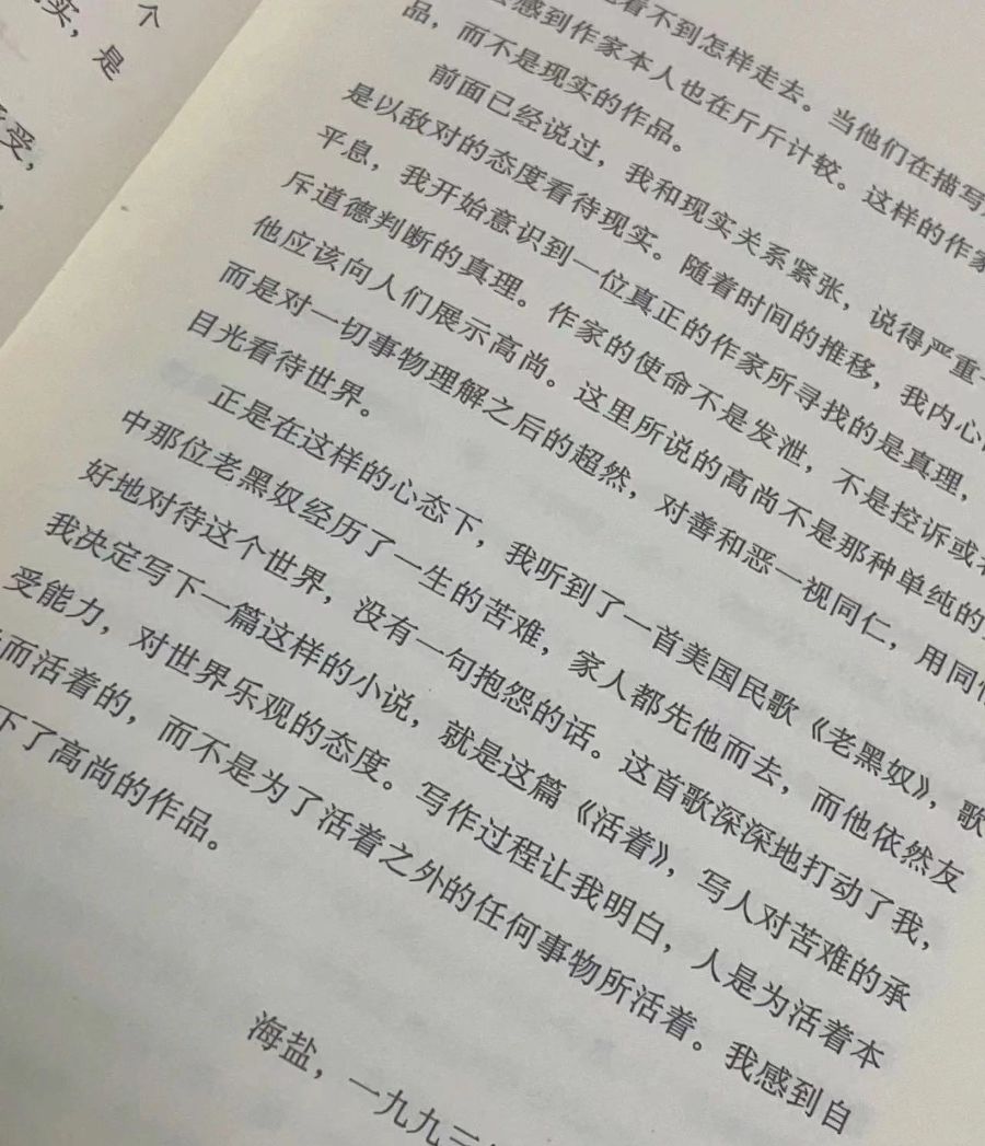我们常常听人说:"人要为理想而活,为亲人而活,为你所拥有的一切而活"可是我却不这么认为,就像余华先生在《活着》一书中所说:"人为本身而活着,而不是为活着以外任何事事物而活着."