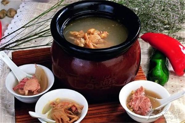瓦罐煨汤,又名民间瓦罐煨汤,1994年名称由民间饭庄所取,江西省民间传统煨汤方法,以瓦罐为器,精配食物加以天然矿泉水为原料,以硬质木炭火恒温传统式六面受热,煨制达七小时以上。