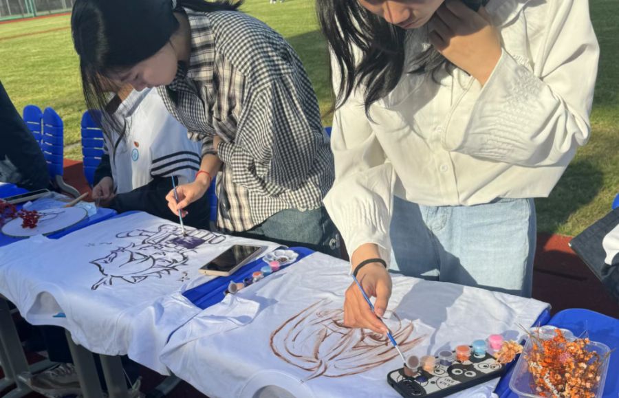 涂鸦 T恤环节成为了现场的一大亮点。面对镜头,2213班的李同学分享了她在遇到低谷时的解决方法,她说:“当我感到压抑或困惑时,我会找朋友们聊天,这样可以得到他们的理解和支持。有时候,我也会选择一个人出去走走,看看大自然的风景,感受大自然的‘味道’。”李同学用她的创作将这份情感释放与友情传递表达得淋漓尽致。她展示了一件与好朋友共同完成的T恤作品,上面印有两人亲手印下的手掌印。手掌印的交错与重叠,象征着他们之间的深厚友谊与相互支持。