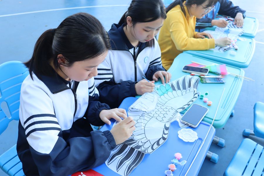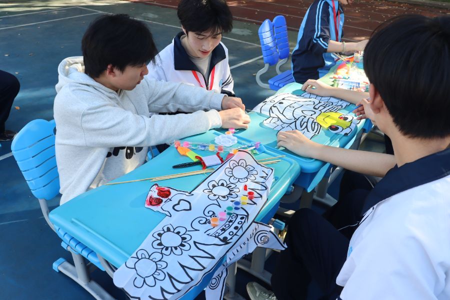 画纸鸢环节在同学们中备受欢迎。在制作中不仅考验了绘画技能, 对于参与者的团队协作能力也有要求。绘制完成后,同学们需将纸鸢组装起来,这一过程考验耐心和细心。通过合作,同学们得以展现自己的创造力和协作精神。