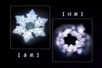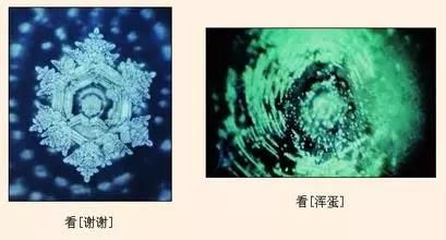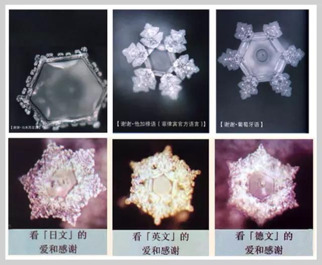 无论是日、英、德任何一种语言,当水看到"谢谢"后,其结晶都非常整齐而美丽。与此相反,不管是哪个国家的语言,只要是看了带有辱骂及攻击性的,例如"浑蛋"等字眼的水,便都散乱得无法形成结晶,而且样子还惨不忍睹。