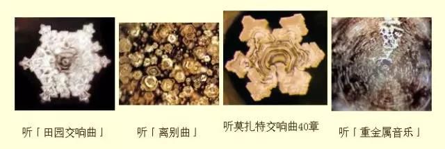 我们听了贝多芬《田园交响曲》的水所呈现的结晶,像这首明快、清爽的曲子一样美丽而工整(下图);而听到对美充满深深祈望的莫扎特的《第40号交响曲》的水,其结晶也竭尽全力展现出一种华丽的美,如下图: