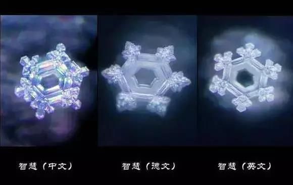 无论是哪种语言,当水看到"智慧"后,其结晶都非常整齐而美丽。图片依次为左图智慧(中文)、右图wisdom(英文)、中图weishieit(德文)