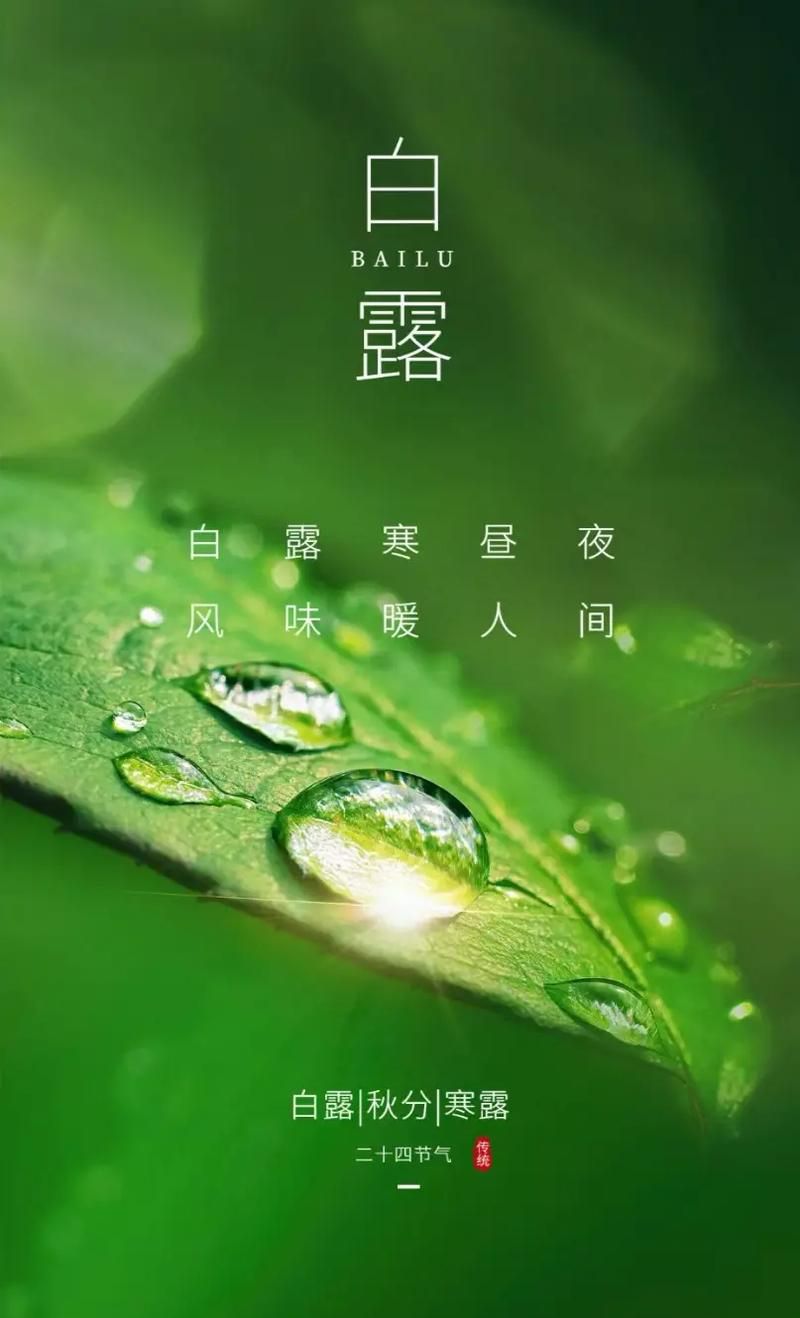 白露,是“二十四节气”中的第15个节气,秋季第3个节气,干支历申月的结束与酉月的起始。斗指庚;太阳达黄经165度;于公历9月7-9日交节。“白露”是反映自然界寒气增长的重要节气。由于冷空气转守为攻,白昼有阳光尚热,但傍晚后气温便很快下降,昼夜温差逐渐拉大。