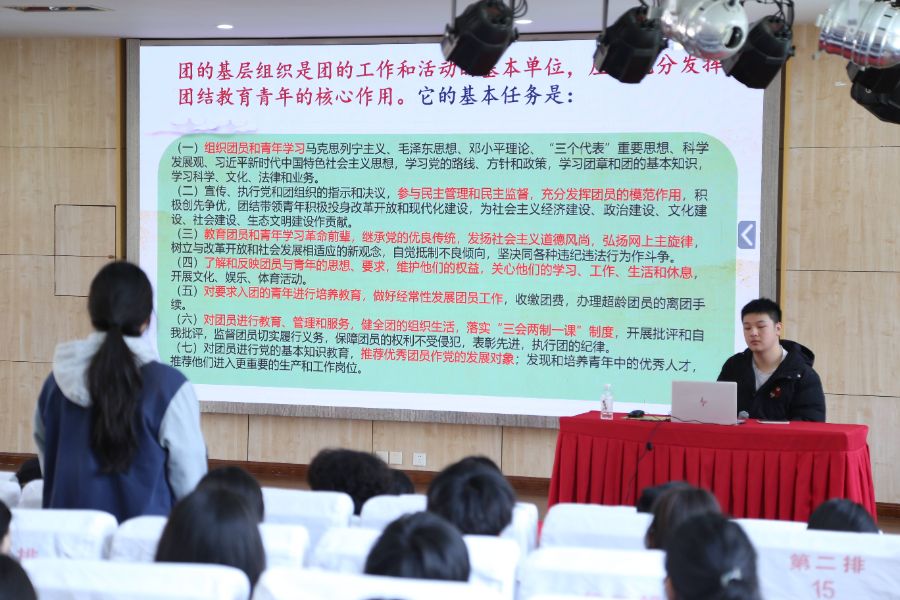 为加强团组织建设,提升团员的思想政治素养和纪律意识,2025年4月3日,中华职业学校团委组织开展了本学期的团课第四讲的学习。本次团课由学校团委书记吕娟老师主讲,团委办公室秘书长何铭琦作为协助,23级、24级入团积极分子参加了此次学习。