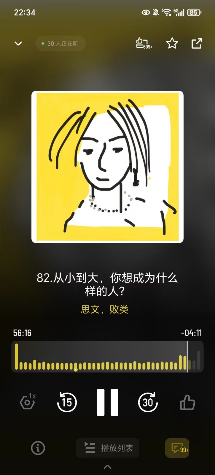 这是一张音频播放界面的截图,画面中央是一幅极简风格的插画,描绘了一位女性形象。插画以简单的线条勾勒出人物的轮廓,背景是明亮的黄色,整体风格清新且富有辨识度。插画下方显示了音频的标题:“82.从小到大,你想成为什么样的人?”以及主播名字“思文,败类”。界面下方是音频播放的进度条,显示当前播放时间已过56分16秒,剩余4分11秒,同时标注了当前有30人正在收听,以及累计点赞数达到699+。界面设计简洁流畅,黑色背景与黄色插画形成鲜明对比,突出了内容的主体性。从整体来看,这是一档以探讨个人成长与梦想为主题的播客节目,其设计风格与内容主题相得益彰,传递出轻松与深度并存的氛围。