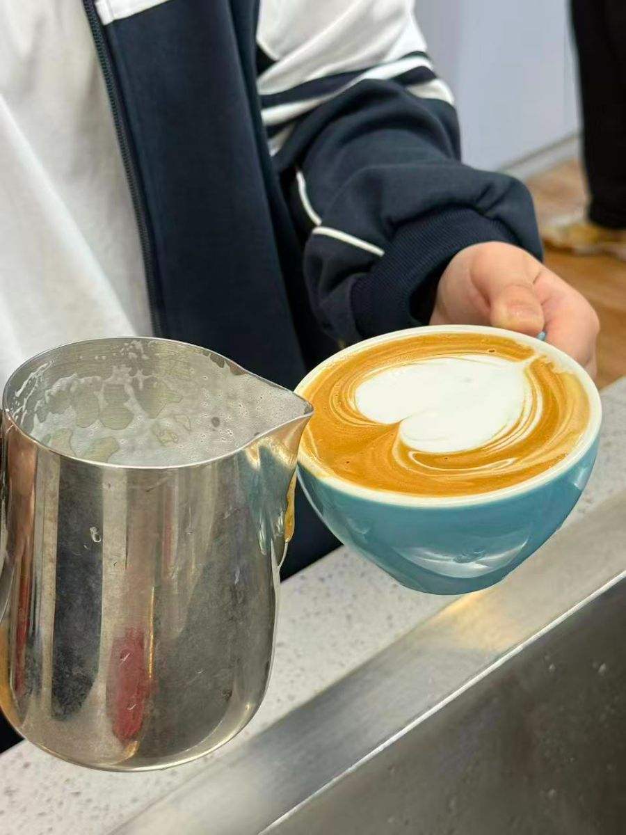 大家围在咖啡机旁,先跟着社长学做浓缩咖啡。看着咖啡豆被细细研磨,粉饼压得均匀平整,按下开关后,金黄的咖啡液缓缓滴落,带着绵密的油脂,每个人都忍不住凑近观察。接着是打奶泡环节,奶缸倾斜,蒸汽棒轻轻插入牛奶,滋滋声中,原本普通的牛奶渐渐变成了绵密如云朵的奶泡,大家轮流上手尝试,即使一开始奶泡不够细腻,也没人气馁。最让人期待的是奶泡融合,将奶泡缓缓倒入浓缩咖啡中,看着两种液体慢慢交融,心里满是成就感。在这里,没有新手与高手的区别,只有彼此的鼓励和分享。每周四的咖啡社团,不仅让我们学会了咖啡技能,更收获了温暖的陪伴。