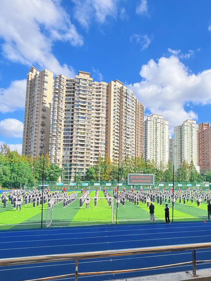 蓝天白云作幕,校园运动场成为青春的舞台。大片绿茵如翠玉铺展,整齐队列似沉默却充满力量的士兵方阵,校服的统一色调里,是少年们蓬勃的朝气与对这场盛会的期待。
