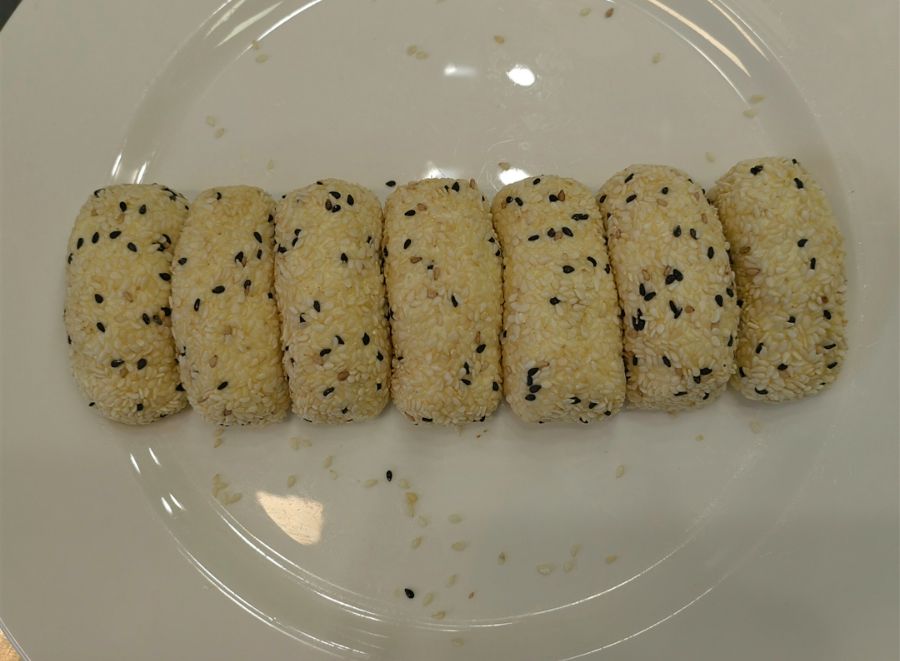 4. 塑形裹芝麻:面团分成20g/个的小剂子,搓成均匀圆球,放入白芝麻中滚一圈,确保表面均匀裹满芝麻(可轻轻按压固定)。