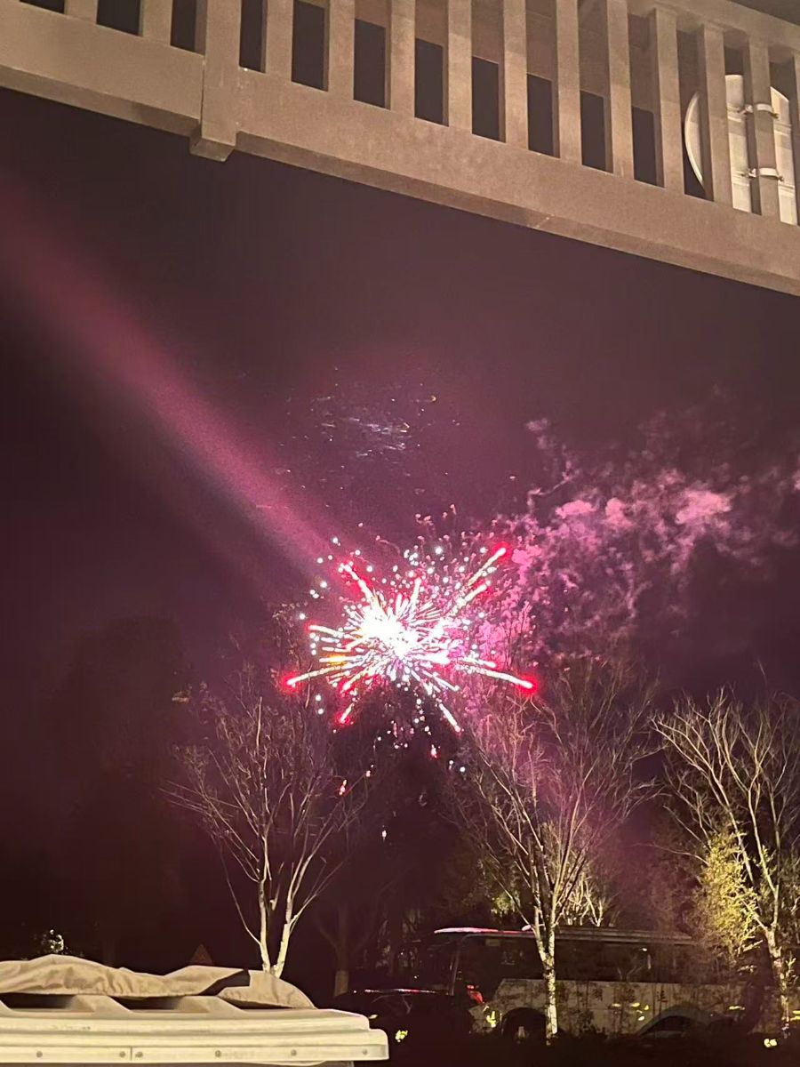 这张照片捕捉了夜晚烟花绽放的瞬间,画面极具氛围感。漆黑的夜空为幕布,中央炸开一朵绚烂的烟花,中心是耀眼的亮白色,向外迸射出细密的金色与红色火星,边缘晕染开大片朦胧的粉紫色烟雾,光影交错间尽显璀璨。画面上方是浅灰色的建筑栏杆,线条简洁,与下方的热闹形成对比;下方可见几棵枝干光秃的树木,轮廓在夜色中清晰,增添了几分静谧。左下角露出白色的栏杆与浅色布料,像是拍摄者身处阳台或露台的视角。整体色调偏暗,唯有烟花的光点亮了夜空,动静结合,既有着烟花绽放的热烈绚烂,又透着夜晚独有的宁静,定格下这转瞬即逝的美好时刻。