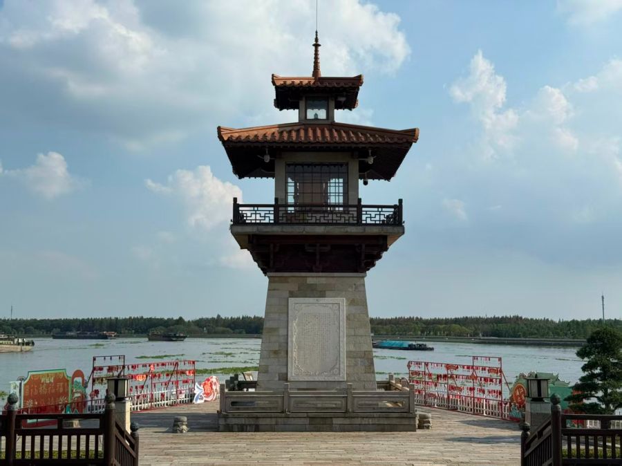 江风从水面上漫过来,带着清润的水汽,吹过塔下的祈福牌,红绳在风里轻轻晃,挂着满满的心愿。远处的货船慢悠悠驶过,犁开细碎的浪纹。岸边的水杉连成一片浓绿,把天际线晕成温柔的底色。蓝天白云漫过塔顶,光影在石砖上缓缓挪动,时间都跟着慢了下来。