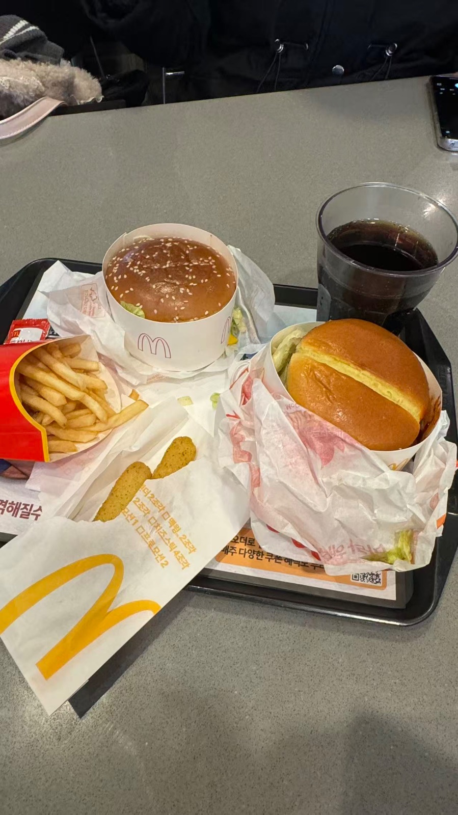 今天和好朋友约了麦当劳,算是给自己的周末加餐啦!一坐下就被托盘上的食物治愈了:两个圆滚滚的汉堡,松软的面包胚裹着鲜嫩的肉饼和脆生生的生菜,咬一口肉汁满满,香到跺脚。一份金黄的薯条刚炸好,外酥里糯,蘸着番茄酱吃,酸甜的味道在嘴里散开,越吃越上头。还有两根香酥的鸡肉条,外皮脆到掉渣,内里的鸡肉嫩到爆汁,一口一个超满足。