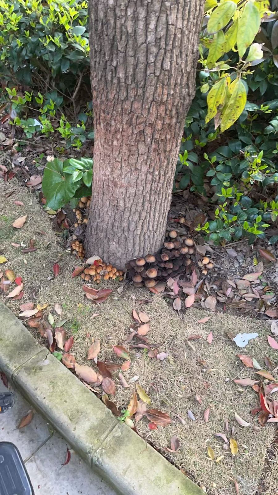 画面中,一棵粗壮的香樟树矗立在画面中央,灰褐色的树皮纹理粗糙而深刻,尽显岁月的质感。树根处的泥土上,密密麻麻地簇拥着一大片棕褐色的小蘑菇,它们紧紧挨着树干生长,形成一片独特的“菌圈”,仿佛给大树的根部围上了一圈毛茸茸的裙摆。树下的草坪略显枯黄,散落着红褐色与暗黄色的落叶,增添了几分秋日的萧瑟。树干两侧是茂密的绿色灌木丛,叶片鲜亮,与枯黄色调形成鲜明对比。一旁的水泥路沿石带着淡淡的青苔痕迹,整体场景静谧自然,展现出城市绿化中不经意间的野趣与生机。