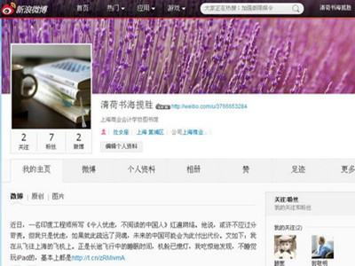为配合2013下半年图书馆读者活动的“微博美文”版块,新学期伊始,信息实训中心开通了学校图书馆的新浪微博,名为“清荷书海揽胜”。借助这个平台,11月图书馆将在学生中开展“好书推荐”活动,以140个字的形式推荐身边的好书。欢迎同学们在新浪微博关注“清荷书海揽胜”。活动的参与方式很简单,只要登录你的微博,写下140个字以内的短评并@“清荷书海揽胜”,即可在线推荐作品。我们将在校图书馆微博转发您的推荐。校图书馆微博的开通将加深图书馆与学生之间的交流,了解学生的当前思想与阅读兴趣。