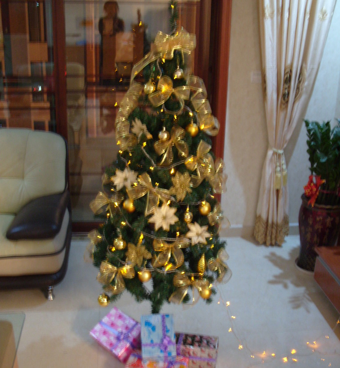 这个是我在一个同学家里看到的,我喜欢这个圣诞树,因为这个圣诞树是欧式手工丝带结丝很好看, 为了效果配有二种或者三种圣诞花还有几个小蝴蝶,还有各种各样的金球球,虽然每个都是一样大小的,但是这种金色的球上有许许多多的图案,还有顶星与五星这些搭配起来都很好看。