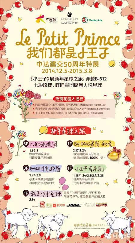 暨庆祝中法建交50周年,上海大悦城举办《小王子》展。这是法国文学瑰宝《小王子》在中国的国内首展 ,室内还有超大梦境玫瑰花田,绝对是最触动你心的治愈系展览哦!