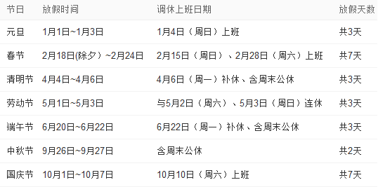 春节已经结束了,不少小伙伴表示对于假期还是恋恋不舍。不要着急,既然三月已经到了,那么清明小长假还会远吗!而且呢,小编要告诉大家一个好消息,根据日历以及政府公告,今年清明、端午、中秋还有劳动节适逢周末,因此大家不必再为了调休补课而晕头转向了~但是不知为何,原本中秋节的三天假期却缩水到了两天。(放假安排详情见下图)