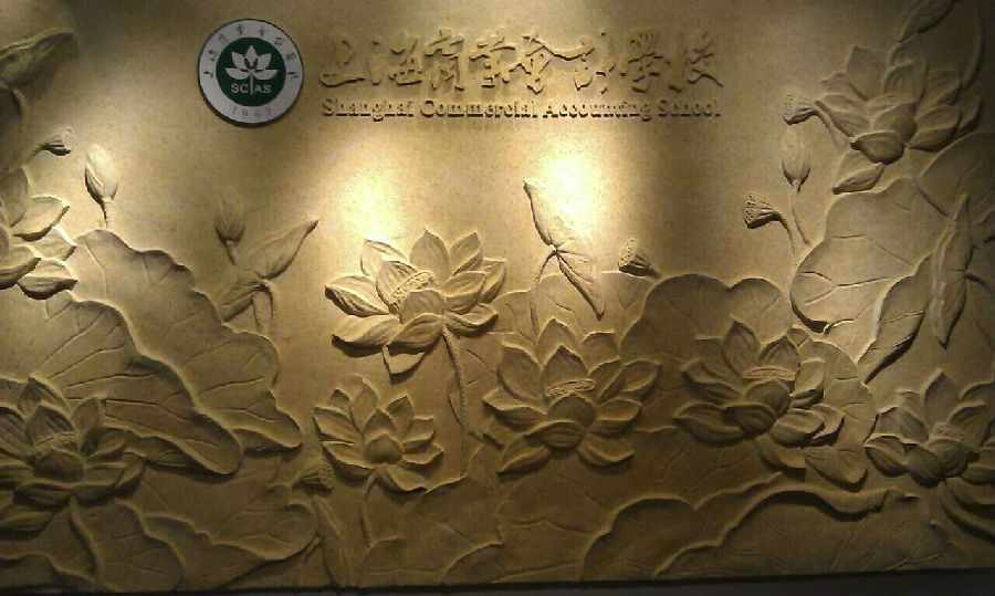 首先映入我们眼帘的这幅莲花浮雕今天也因您的到来而熠熠生辉,我们之所以选择莲花胜景作为照壁,是取意于北宋周敦颐《爱莲说》“予独爱莲之出淤泥而不染,濯清涟而不妖”,将莲花作为学校的校标,勉励商会学子仿效莲花高洁的品格,即使是面对金山银山也依旧能保持莲花般君子之心。校标上“SCAS”这四个字母,是我们学校英文名的缩写,“shanghai commerical accounting school”。下面的阿拉伯数字表明我校始建于1962年。