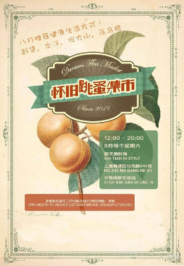 话说八月魔都的郁闷梅雨季应该也结束了吧?窝在家里和办公室的你是不是已经发霉了?这可不是怀旧跳市想要看到的健康生活方式!八月来了,该呼朋唤友带上狗狗们来马当路上晒晒树荫下若隐若现的阳光,赶赶集,出出汗,侃侃大山,释放一下各种小郁闷,一切都会好起来,真正的夏天也只是刚刚到来!
